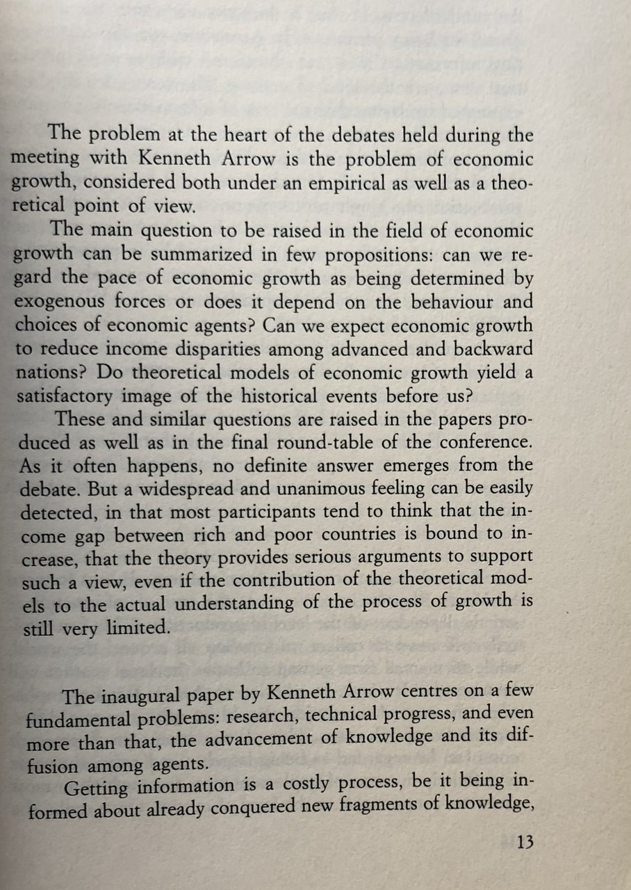 Soggetti: Economia, Etica, Conversazioni, Incontri, Seminari, Arrow, Kenneth Joseph, 1921, Congressi, Convegni, Atti, Equilibrio economico generale, Asimmetria informativa, Teoria della crescita endogena, Scienze Sociali, Modelli economici, Disparità, Crescita, Nazioni povere, Ricchezza, Sviluppo, Terzo Mondo, Mercato, Profitto, Teorema dell'impossibilità, Economisti statunitensi, Premio Nobel, Essays, Gérard Debreu, The Economics of Information, Conditioning, Economic Growth, Classical Tradition, General Equilibrium, Disparities, Advanced and backward nations, Theoretical models, Debates, Gap, Rich and Poor countries, Theories, Investment equation, Economics, Ethics, Conversations, Meetings, Seminars, Conferences, Conventions, Acts, Informational Asymmetry, Theory of Endogenous Growth, Social Sciences, Models, Development, Third World, Market, Theorem of impossibility, US Economists, Nobel Prize
