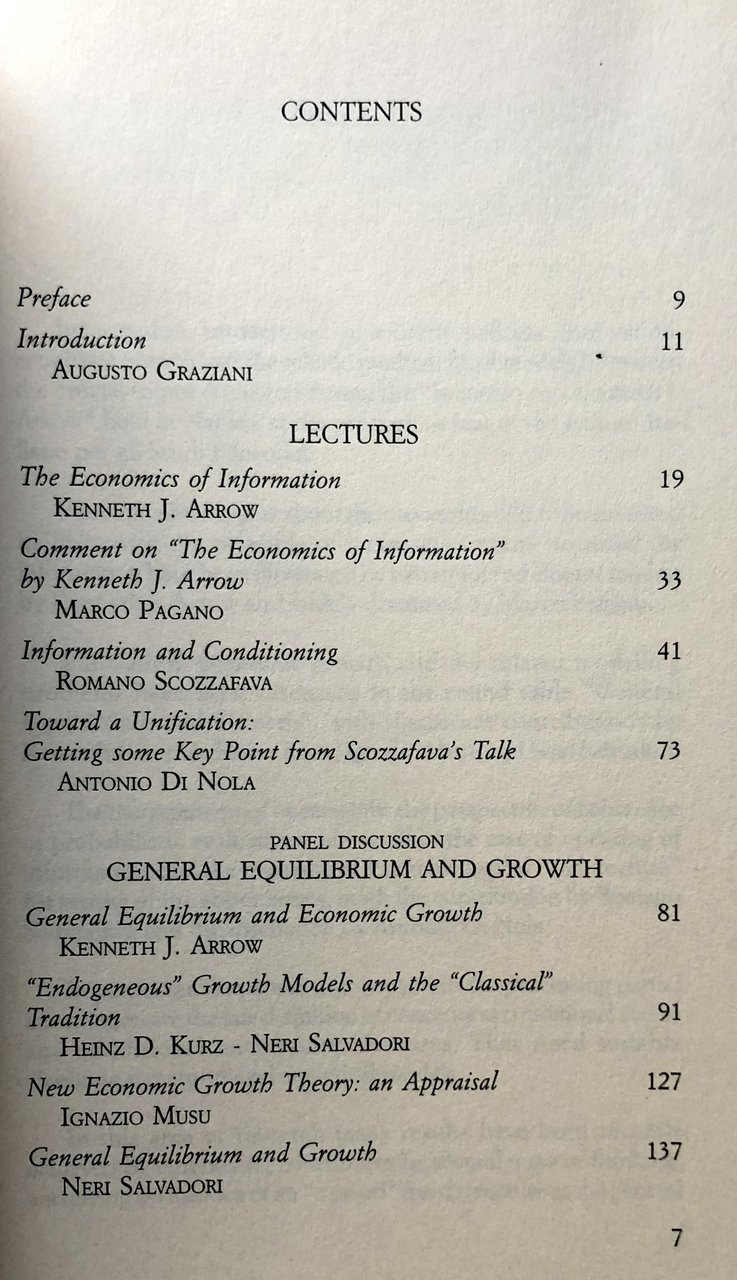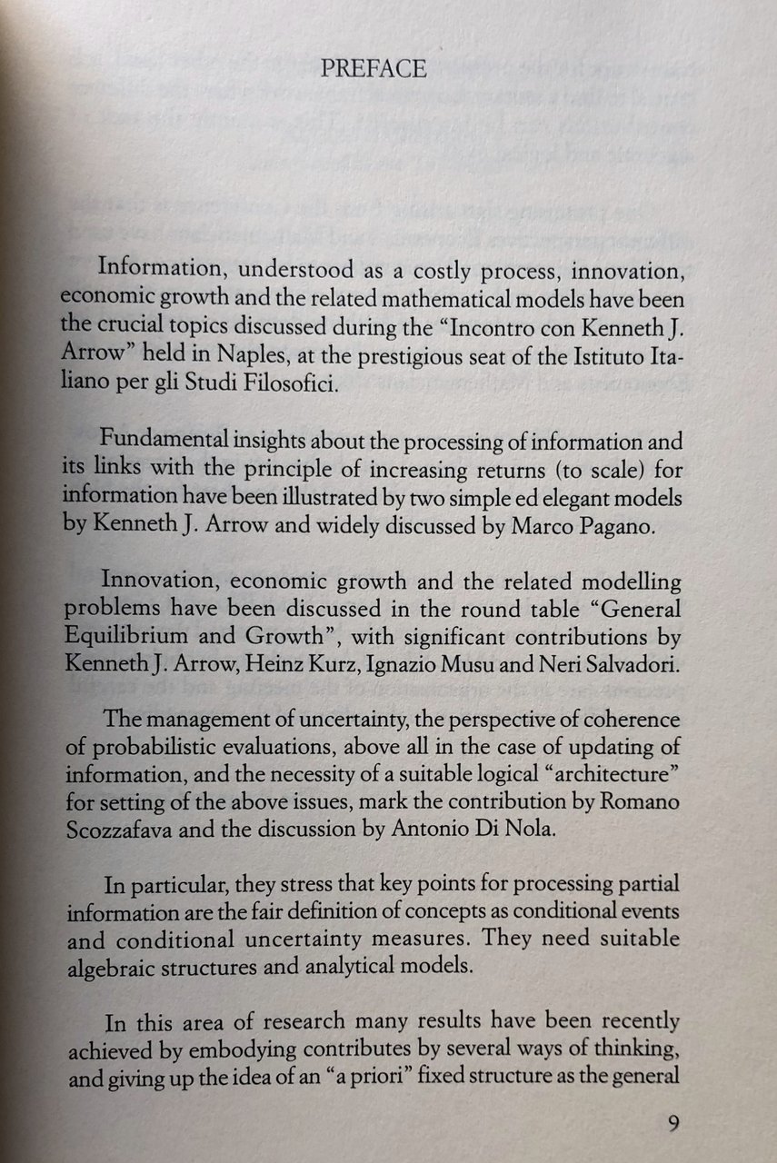 PREFACE. Information, understood as a costly process, innovation, economic growth and the related mathematical models have been the crucial topics discussed during the Incontro con Kenneth J. Arrow held in Naples, at the prestigious seat of the Istituto Italiano per gli Studi Filosofici. Fundamental insights about the processing of information and its links with the principle of increasing returns (to scale) for information have been illustrated by two simple ed elegant models by Kenneth J. Arrow and widely discussed by Marco Pagano. Innovation, economic growth and the related modelling problems have been discussed in the round table General Equilibrium and Growth, with significant contributions by Kenneth J. Arrow, Heinz Kurz, Ignazio Musu and Neri Salvadori.