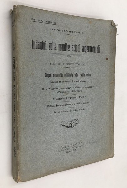 INDAGINI sulle MANIFESTAZIONI SUPERNORMALI. Prima serie. Cinque monografie pubbl. sulle riviste estere. MARCHE ed IMPRONTE di MANI INFOCATE; della "VISIONE PANORAMICA" o "MEMORIA SINTETICA" nell'IMMINENZA della MORTE; a proposito di "Patience WORTH"; William STAINTON MOSES e la CRITICA SCIENTIFICA; di un DEFUNTO che TUTTO RICORDA.