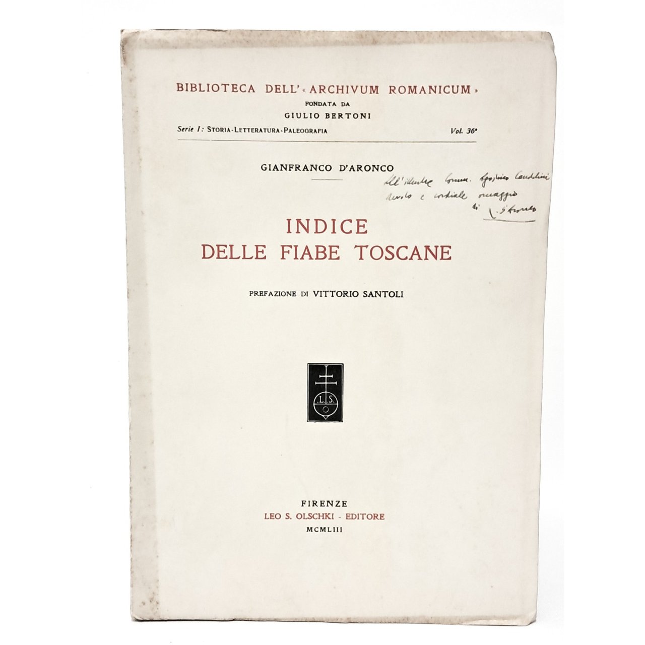 PRIMA EDIZIONE. Serie di storia letteratura e paleografia della Biblioteca dell'archivium romanicum. Dedica autografa sulla copertina. Prefazione di Vittorio Santoli Opera che prende spunto da The types of the folk tale di Thompson-Aarne e Motif-Index of folk-literature: in particolare la parte intitolata Tipi delle fiabe si riferisce alla prima opera, mentre la seconda Motivi delle fiabe, all'opera successiva. La preferenza dell'autore va alla fiaba toscana non solo perché in essa sono raccolte numerose prose popolari, talune delle quali dovute a riconosciuti maestri, ma anche per i motivi che si trovano in esse. A questo propositi viene fatto un catalogo dei motivi accolti nelle fiabe popolari e ricostruzione delle vie da essi percorse e della loro origine. In brossura. Pp. 234. Buone condizioni.
