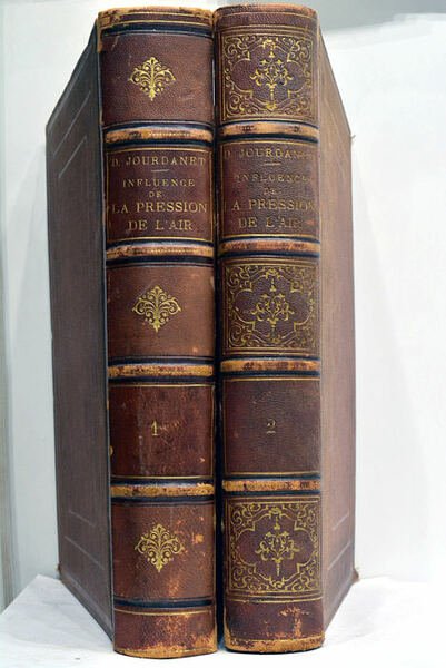 2 volumes. 2 feuillets. III. 388 pages. 2 feuillets. + 2 feuillets. 423 pages. 2 feuillets. + 43 planches et cartes hors texte dont 6 en couleurs. (27,5x19 Cm). Demi chagrin. Dos à nerfs orné. Tranches dorées. Coins et coiffes émoussés. Charnières partiellement fendues. Dos et plats frottés. Le travail d'observation de Jourdanet dans des régions reculées d'Amérique latine et d'Asie a permis de démontrer que le mal de l'altitude est dû à l'anoxémie. 43 planches et cartes hors texte dont 6 en couleurs. Papier légèrement jauni. Bon exemplaire. Décor des reliures un peu différent.