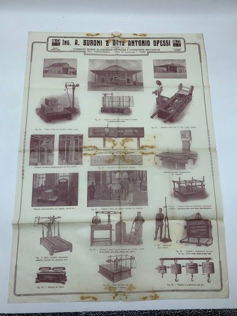Manifesto pubblicitario in carta velina (aperto misura cm 49 x 68 circa) con pieghe centrali e alcuni aloni al centro del foglio e ai margini, non datato, ma ascrivibili al primo Novecento, con illustrazioni di alcuni modelli di bilance e stadere prodotte da questa ditta di Torino.