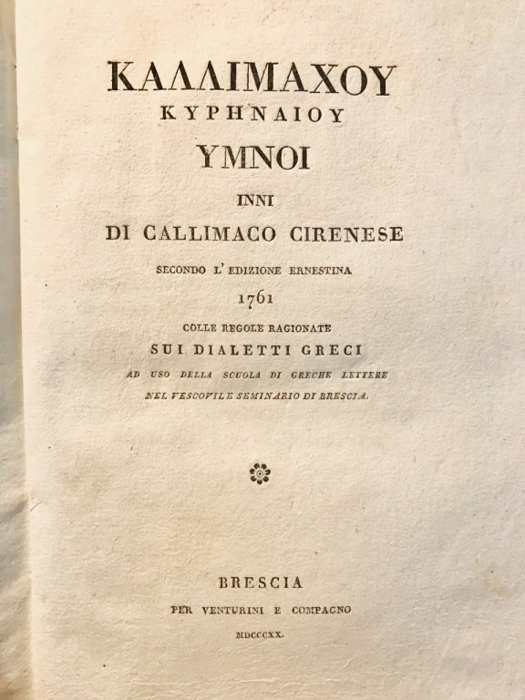 Inni di Callimaco Cirenese secondo l'edizione ernestina 1761 colle regole ragionate sui dialetti greci ad uso della scuola di Greche Lettere nel vescovile seminario di Brescia.