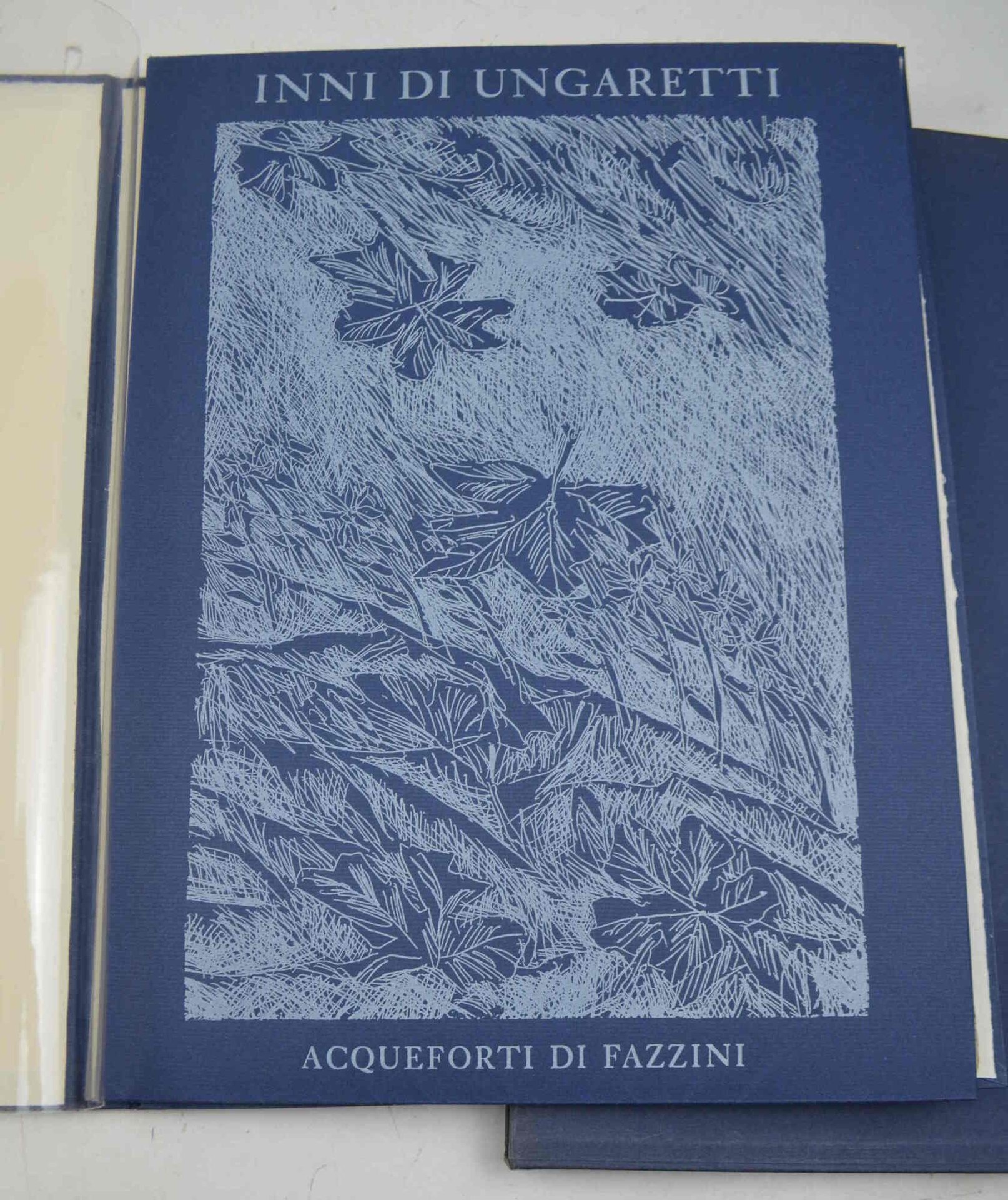 Cm. 37, pp. 27 (7). Con 3 acqueforti firmate di Pericle Fazzini e protette da velina. Leg. edit. in cartoncino leggero illustrato protetto da acetato ed entro custodia in cart. rigido con titoli su etichette a stampa. Ex libris inciso. Perfetta conservazione. Testo italiano. Pregiata edizione stampata in tiratura limitata di 150 esemplari numerati (n. 90) impressi a mano su carta a tino Magnani di Pescia in carattere Janson tondo c. 20. Volume appartenente alla celebre collana "I poeti illustrati" e n. 34 del catalogo Editiones Dominicae.