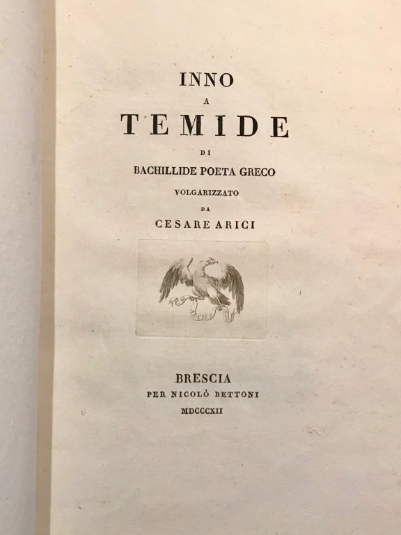 In-folio (cm. 36), brossura rosa coeva (piccolo strappo riparato al piatto post.), pp. [2b] 16 [2b] in ottimo stato, con vignetta calcografica al frontespizio (aquila). Raro volgarizzamento dell'Arici dedicato al barone Teodoro Somenzari, all'epoca divenuto prefetto del Mella. Ottimo esemplare. (SP3)