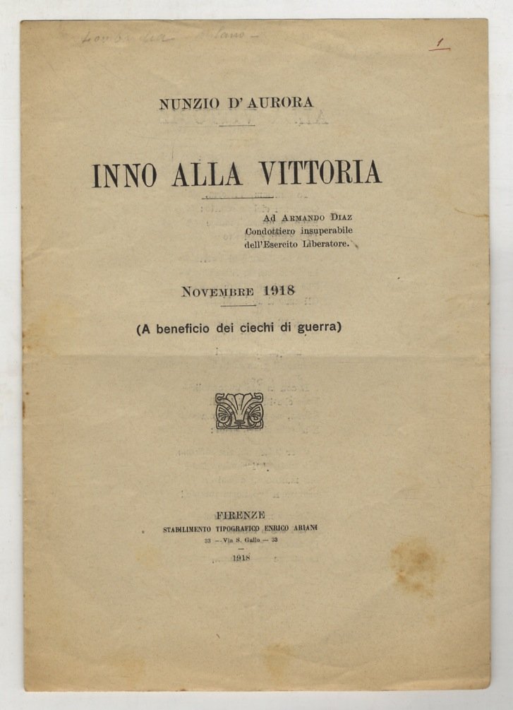 Inno alla vittoria. Ad Armando Diaz. Condottiero insuperabile dell'Esercito Liberatore. Novembre 1918. A beneficio dei ciechi di guerra.