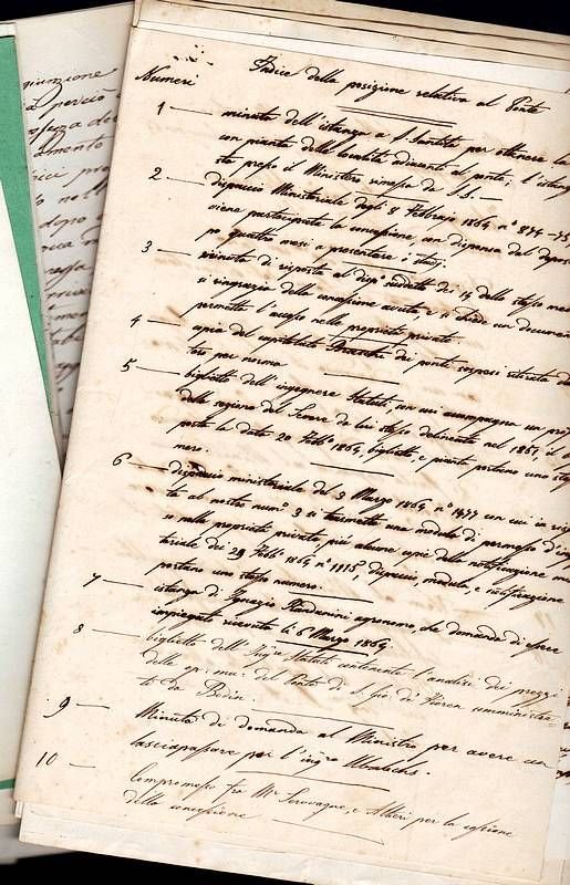 Cartella muta contenente 20 missive tra ingegneri, rappresentanti lo Stato Pontificio ed altri sulle concessioni e regolamenti per la costruzione del ponte, tutti raccolti in altro foglio manoscritto con indicizzazione degli stessi con numerazione corrispondente. (Ai numeri 1-4-5, si annunciano disegni e si indica la mancanza nel fascicolo per la conservazione presso altre persone). SEGUE:- Progetto di Capitolato per la concessione di un Ponte fisso di ferro sul Tevere alla Regola, articolato in 37 punti e presente sia manoscritto su fogli volanti, (mancate del primo foglio con i 5 primi punti delle regole, ma con lo stesso in stampa e completo.
