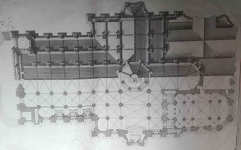 Insieme di tre incisioni raffiguranti spaccati e pianta del cimitero in parte già costruito su disegno del Prof. L. Voghera.