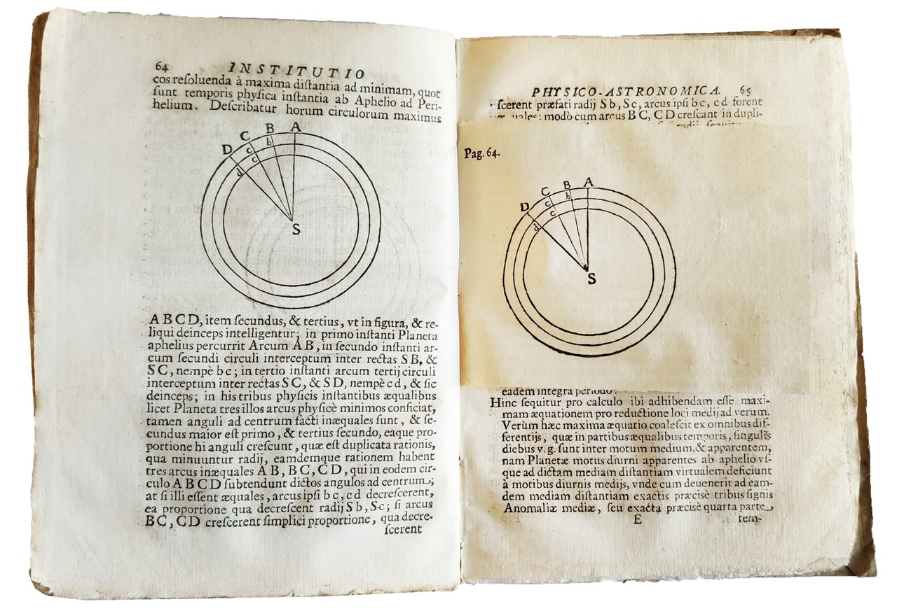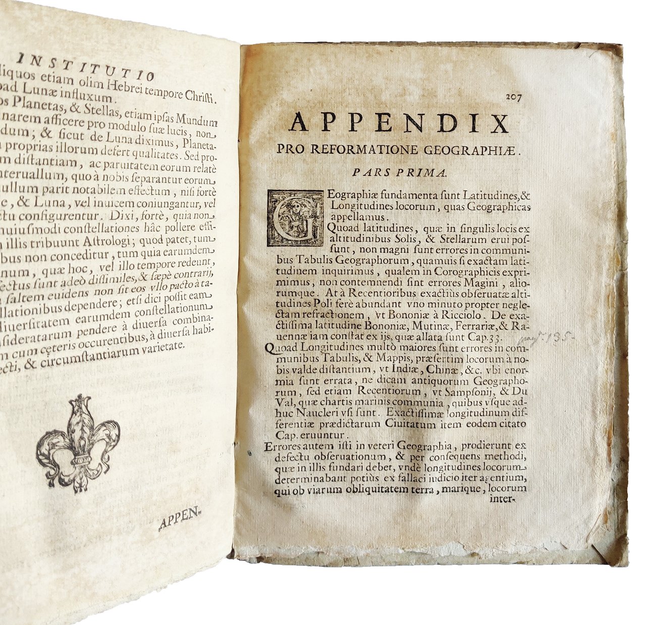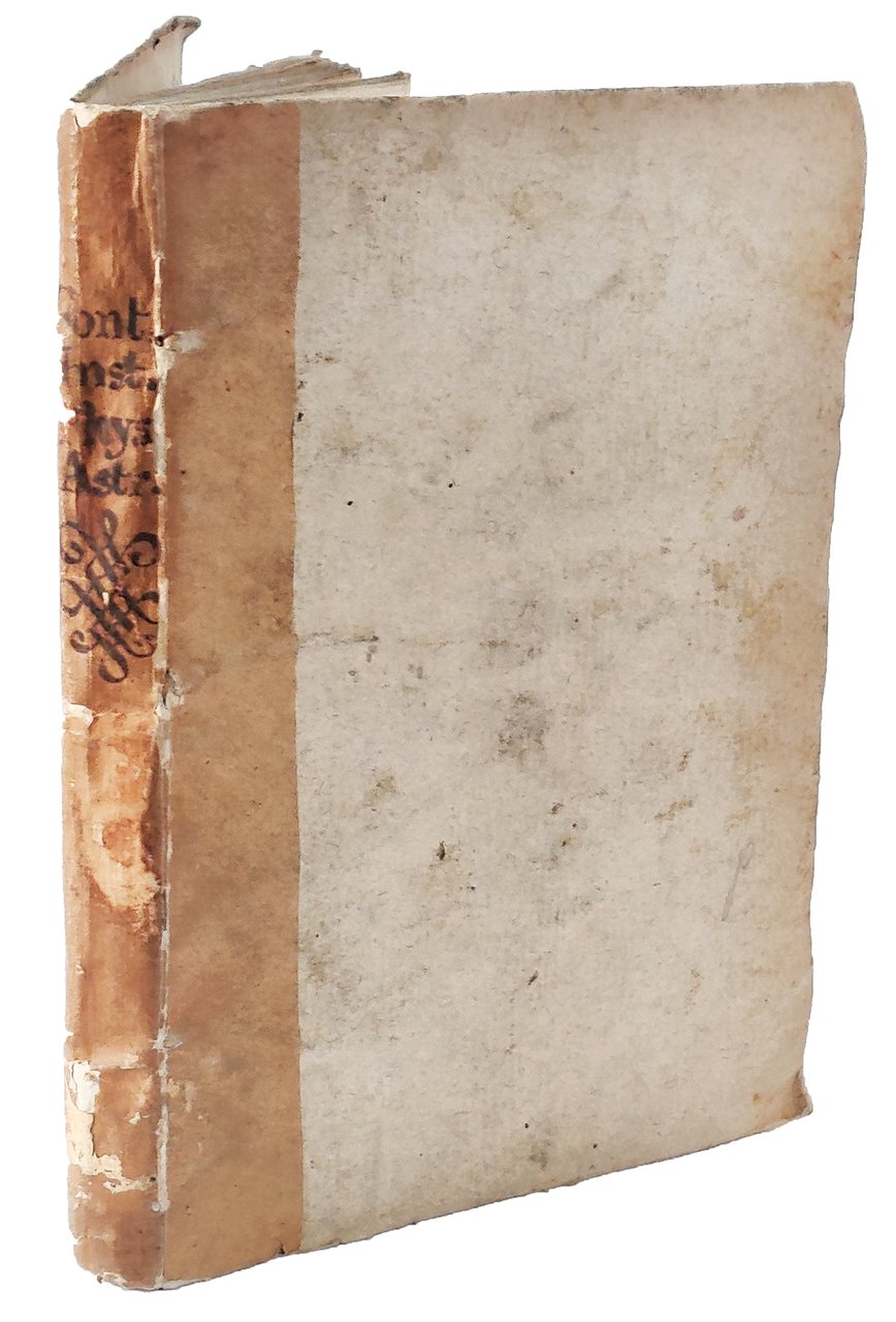 In 4to (mm. 199x148). Pp. XVI, 230 ed 1 tavola fuori testo tra le pp. 64 e 65. Segnatura: +8 A-O8 P4. Manca l'ultima carta bianca. Vignetta astronomica incisa in legno al titolo e numerosi diagrammi nel testo. La tavola è presumibilmente un cancellans per la figura molto simile di p. 64. Cartonato coevo, dorso rinforzato anticamente con titolo manoscritto. Timbri dei Gesuiti di Milano sul titolo e sulla carta seguente, etichetta con segnatura al verso dell'occhietto. Annotazioni manoscritte sui contropiatti. Lievi fioriture marginali, titolo un po' sporco, nel complesso buona copia intonsa con barbe.