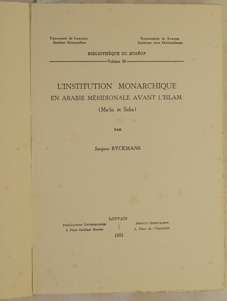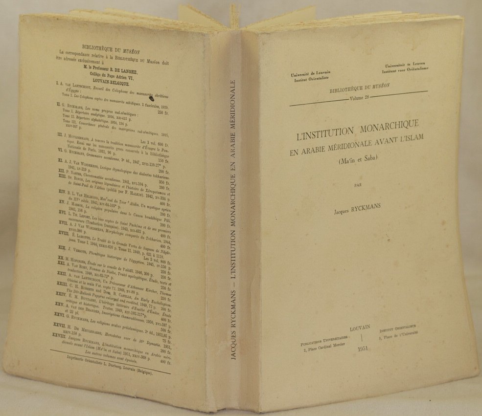 In 4. Dim. 27x18,5x4,5 cm. Pp. XXI+(3)+368. Interessante opera storica del 1951 su Ma'in e Saba, l'istituzione monarchica in Arabia Meridionale prima dell'Islam scritto da Jacques Ryckmans della collana "Bibliotheque du Museon n. 28". Ampia bibliografia ad inizio opera. All'interno: I re di Ma'in, Mukarrib de Saba, Reame di Saba, i Re di saba e Du Raydan, Hadramawt e Yamanat, Re di Saba dell'epoca tardiva fino e dopo la seconda occupazione abissina, Note di cronologia e storia ecc. Alla fine appendici: Lista dei Re, CIH 537+RES 4919, Iscrizioni, Riferimenti alle iscrizioni, Sovrani sud arabi menzionati ecc. Mappe ed illustrazioni all'interno. In buone condizioni. Copertina editoriale in buone condizioni generali con lievi usure ai margini e dorso. Legatura in buone condizioni. All'interno le pagine si presentano in ottime condizioni con rare fioriture. Interesting historical work of 1951 about Ma'in e Saba, the monarchic institution in Southern Arabia before Islam written by Jacques Ryckmans of the series "Bibliotheque du Museon n. 28". Wide bibliography. Inside: The Kings of Ma'in, Mukarrib de Saba, Royaume of Saba, The Kings of Saba and Du Raydan, Hadramawt and Yamanat, King of Saba oflate period before and after second abyssianian occupation, Notes of chronology and history etc. Appendix at the end: List of Kings, CIH 537+RES 4919, Iscriptions, Refeerings to inscriptions, South arabian soverains etc. Maps and illustrations inside. In good conditions. Editorial cover in good general conditions slightly worn in the edges and spine. Binding in good conditions. Inside pages are in very good conditions with occasional foxings.