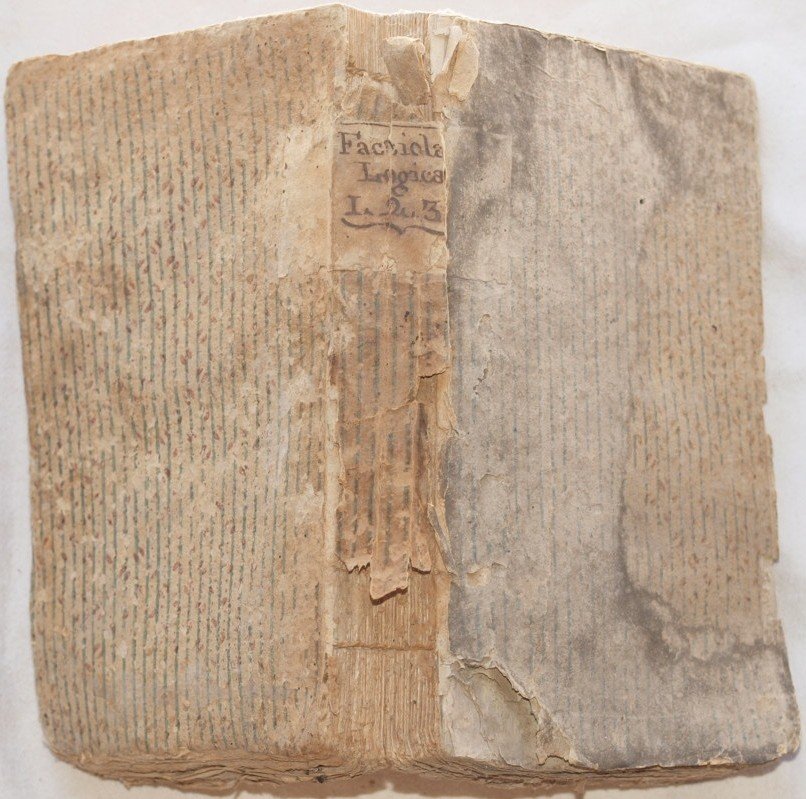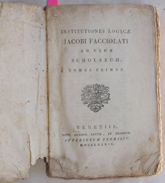 In 8. Dim. 21x13,5 cm. Pp. (4)+127, 222, (6)+168. Edizione del 1789 di questa interessante opera di filosofia scritta da Jacopo Facciolati (1682-1769) nato a Torreglia e morto a Padova, sacerdote, filologo, latinista e filosofo. Facciolati venne ordinato sacerdote nel 1704 e conseguì la laurea nello stesso anno. Insegnò logica all'Università di Padova. L'opera sono una serie di istituzioni di logica. Tra gli argomenti trattati: logica, verità del segno, divisione, enunciazione, raziocinio, sillogismo, metodo, predicabilia, predicamenti, analitiche, topiche, sofistica, acroasio, lettere ecc. Alcune figure all'interno. Purtroppo risultano mancanti le pagine dalla 6 alla 13 del tomo secondo. In discrete condizioni, in barbe. Copertina morbida coeva in mediocri condizioni generali con usure e parti mancanti ai margini e dorso. Dorso in parte staccato. Legatura in discrete condizioni con rotture. All'interno le pagine si presentano in buone condizioni con fioriture. Mende. Qualche lieve gora d'umidità marginale. Usure al margine inferiore delle prime otto pagine. Edition of 1789 of this interesting work of phylosophy written by Jacopo Facciolati (1682-1769) priest, phylologist, latinist and phylosopher. Facciolati was ordinated priest in 1704 and obtained the degree the same year. He teached logic in the university of Padoa. The work are a series of institutions of logics. Between the issues treated: logics, truth of sign, division, enunciation, sillogism, method, predicabilia, predicaments, analitics, topics, sophystics, acroasio, letters ecc. Some illustrations inside. Unfortunately pages from 6 until 13 of the second tome are missing. In fair conditions, uncut copy. Soft coeval cover in poor general conditions with wearings and missing parts in the edges and spine. Spine is partially detached. Binding in fair conditions with cracks. Inside pages are in good conditions with foxings. Usage signs. Some slight humidity signs in the edges. WEarings in the lower edge of the first 8 pages.
