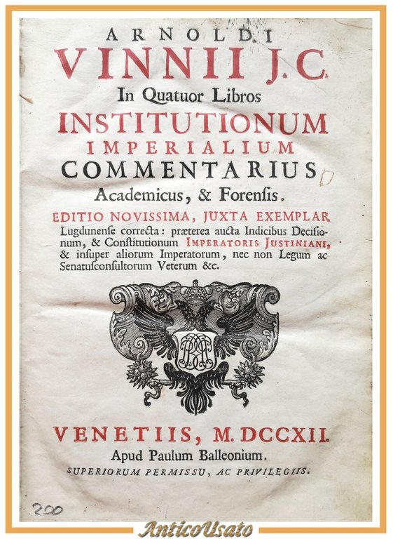 INSTITUTIONUM IMPERIALIUM COMMENTARIUS di Arnoldi Vinnii 1712 Balleonium Libro