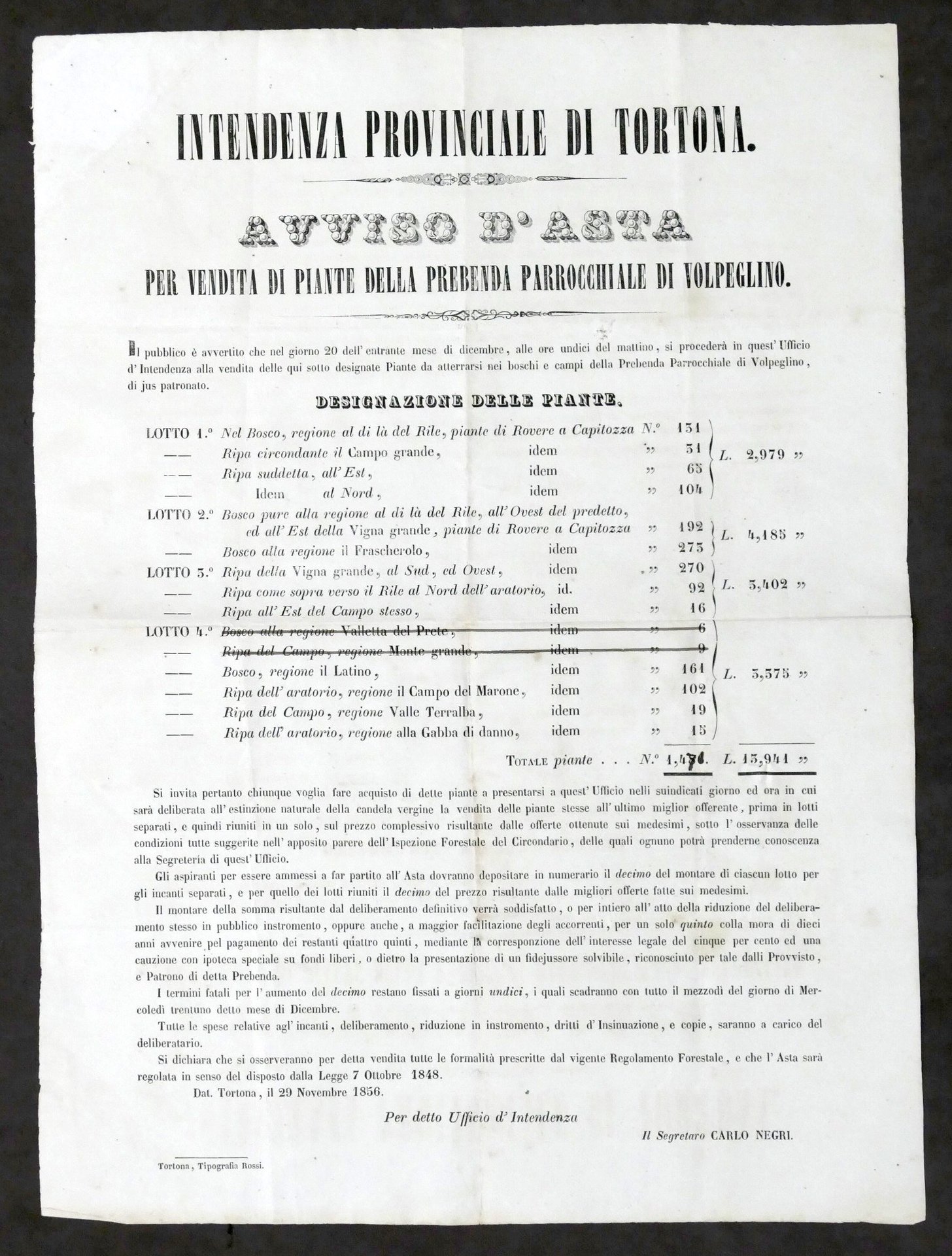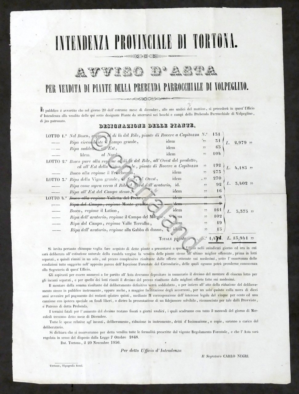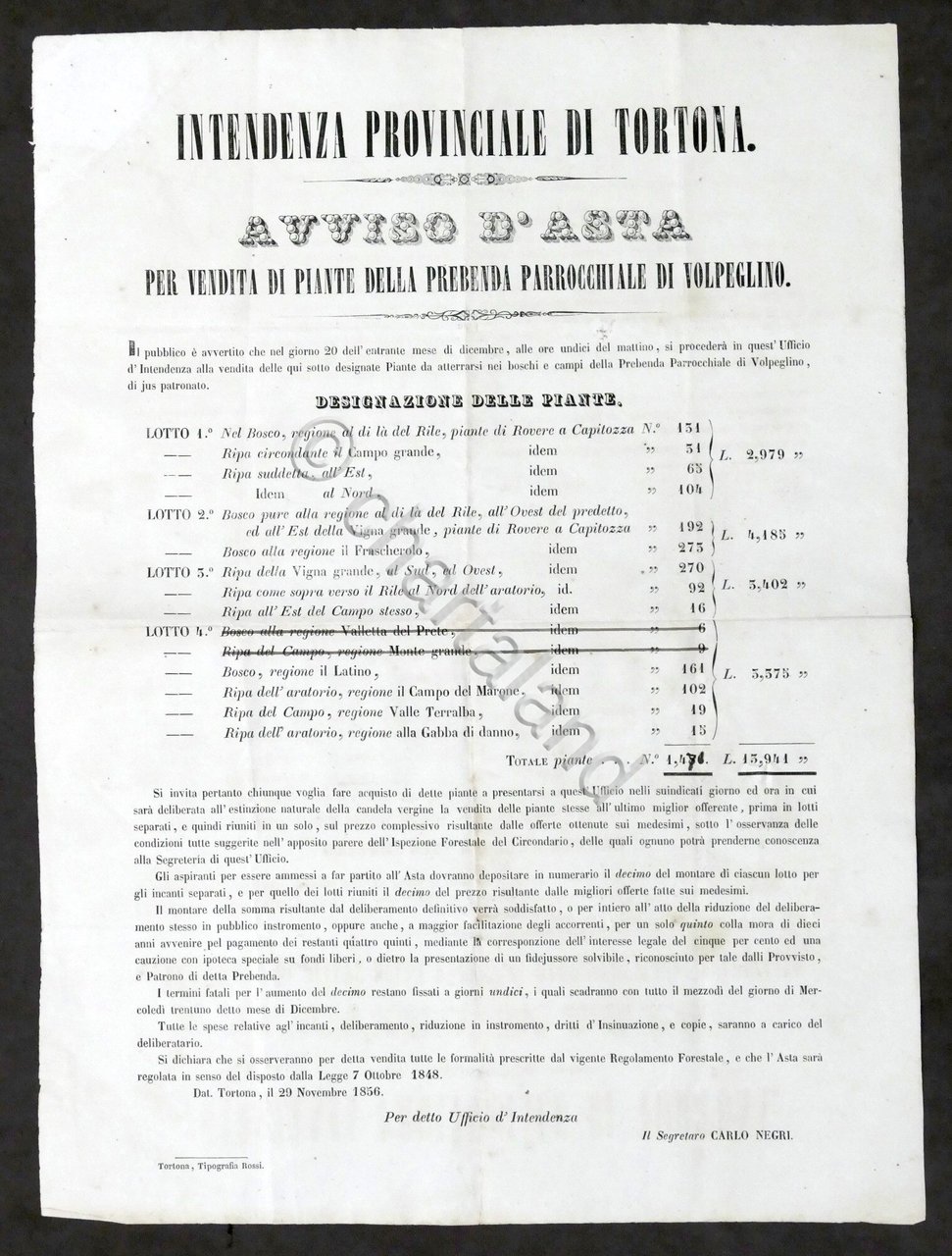 Intendenza Provinciale di Tortona - Avviso d'Asta per vendita di piante della prebenda parrocchiale di Volpeglino - 29 novembre 1856 Un foglio ripiegato, dimensioni: 30,5 x 42 cm ca. Lingua italiana. Condizioni buone.