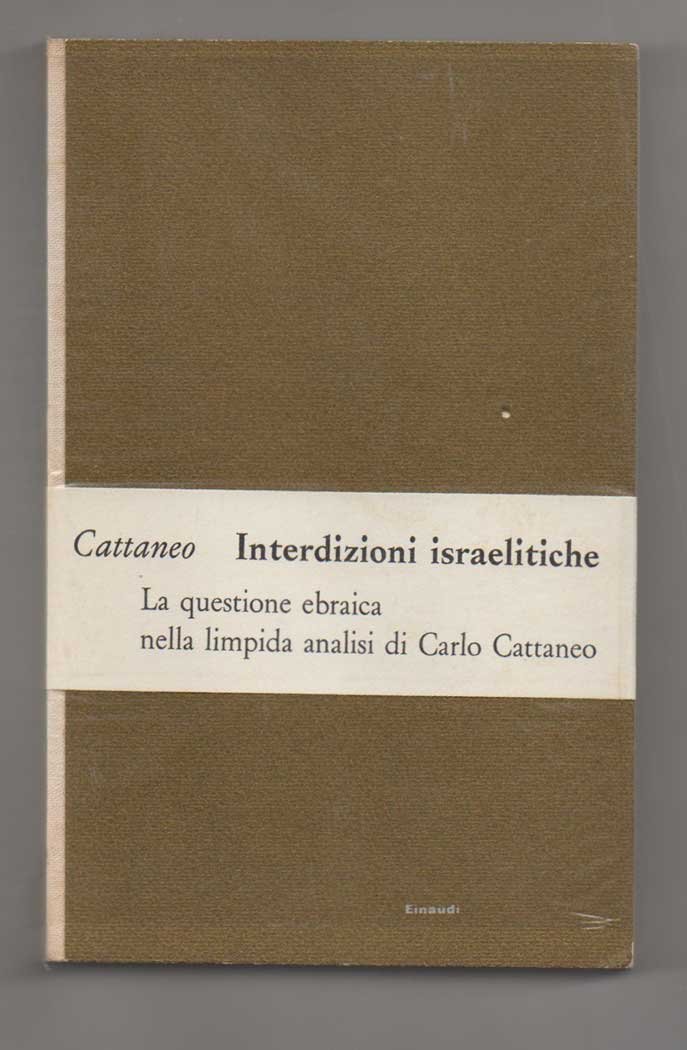 LIBROPrima edizione Einaudi.Ottimo esemplare. Conserva il pergamino protettivo e la fascetta editoriale: «Interdizioni israelitiche. La questione ebraica nella limpida analisi di Carlo Cattaneo».Saggio «che sottolinea, sì, le ragioni di equità e di giustizia, in definitiva di libertà, in rapporto agli ebrei, ma non meno quelle di convenienza pratica, economica» (Ernesto Sestan, «Cattaneo», voce del «Dizionario biografico degli Italiani» volume 22, 1979).