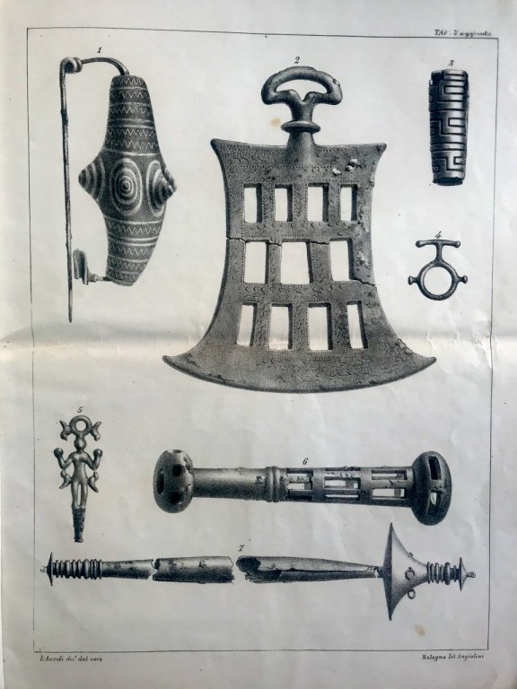 <span style="font-style: normal;">In-4° (cm. 34,6), brossura editoriale a stampa (invio autografo dell'autore al margine); pp. 15 in buono stato con 1 grande tavola litografica f.t. di Angiolini (su disegno dal vero di Aureli); segno di piega. Interessante opuscolo per le origini dell'archeologia bolognese: Gozzadini aveva scoperto in una sua tenuta agricola le prime tombe della necropoli di Villanova (</span><i>Di un sepolcreto etrusco</i>, Bologna 1854) ed eseguito gli scavi a sue spese. Buon esemplare. (NJ1)