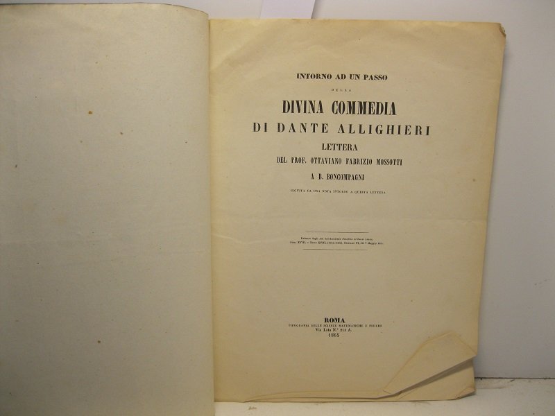 In 4, pp. 8. Omaggio autogr. al p.a nt. di B. Boncompagni. Br. muta coeva. Lettera di Ottaviano Fabrizio Mossotti relativa al verso 97 del secondo canto del Paradiso dantesco, seguita da una nota di B. Boncompagni in relazione alla lettera precedente.