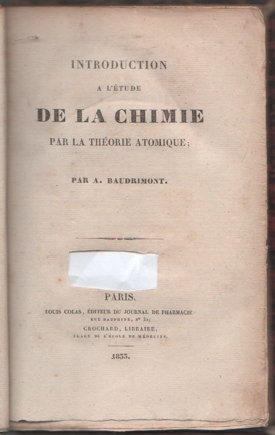 Introduction a l'ètude de la chimie par la thèorie atomiqueAlexandre-Edouard BaudrimontColas, 1833. Parigi. In 8°; pp. 268; cartonato con piatti marmorizzati e dorso in pelle; piccola mancanza al frontespizio senza perdita di testo come da immagine; tracce di gioriture all'interno; abrasioni e tracce d'uso alla copertina; interno in buono stato.coll. 14B-02