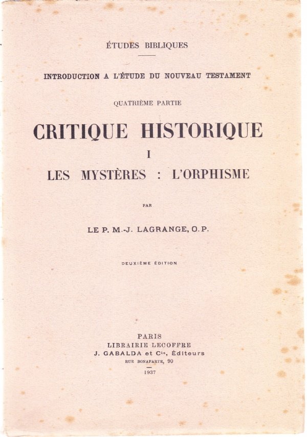 Introduction à l'étude du Nouveau Testament. Quatrième partie. Critique historique I. Les mystères: L'Orphisme