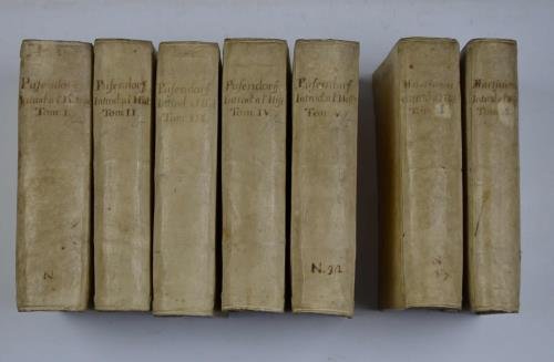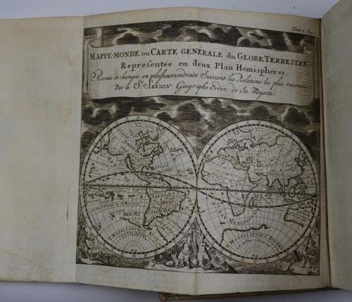 Sette volumi di cm. 17, pp. 3.500 ca. complessive. Con bell'antiporta figurata a ciascun volume e molte carte geografiche più volte ripiegate f.t. Solida legatura coeva in piena pergamena rigida con titoli ms. ai dorsi. Qualche abrasione ai bordi di alcuni volume, poche altre tracce d'uso, complessivemante esemplare genuino ed in buono stato di conservazione. I primi 5 volumi (nell'edizione del 1743) trattano della storia e della geografia europea, mentre l'appendice degli ultimi due volumi finali (nell'edizione in due volumi del 1739) riguarda Africa ed America.