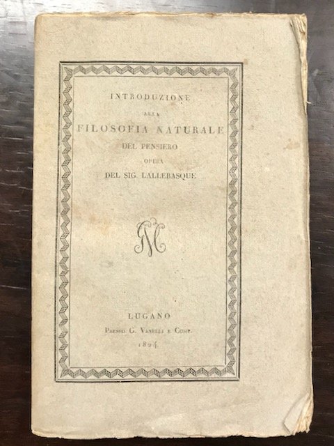 <span style="font-style: normal;">In-8° (cm. 20,8), brossura editoriale a stampa, pp. 242 in buono stato e in barbe, alcune fioriture. Pirro Lallebasque è anagramma di Pasquale Borrelli [Passano-Rocco, </span><i>Supplemento al Dizionario delle opere anonime e pseudonime di G. Melzi</i>, p. 16]. Edizione originale di una delle opere principali del filosofo, che rientrato dall'esilio politico del 1821 propone la sua concezione filosofica ispirata agli ideologi francesi interpretata in senso positivistico. Buon esemplare genuino. (NF1)