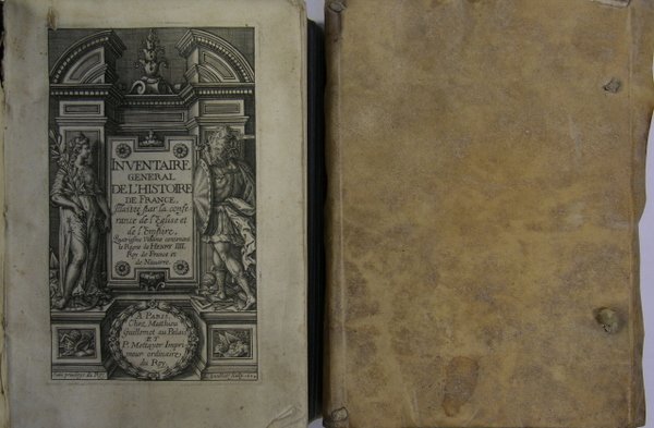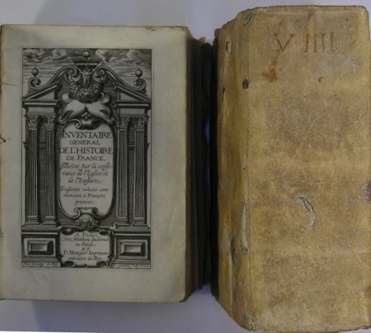 A Paris, chez Matthieu Guillemot & Mettayer imprimeur, 1608. 2 volumes fort in/8 en reliure plein velin du temps, dos lisses aveugles, pages de titre gravées (L. Gaultier) ; tome 3 : "François premier" 2 f., 902 p., 18 f. de table - tome 4 : "Henri IIII" 2 f., 1131 p., 23 f. de table. Menus défauts en tome 4 (manques en plat inférieur et petit enfoncement sur le dos) ; auréole claire sur les feuillets de la table ; des erreurs et saut de pagination sans manque de texte ; dans l'ensemble un bon exemplaire. Jean de Serres, historien et théologien (1540 Villeneuve-de -Berg, Ardèche - 1598 Genève) Pasteur et professeur à Lausanne puis à Nîmes - Historiographe du roi de France Henri IV.
