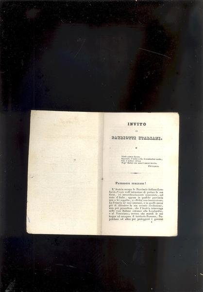 IN 24° ( mm.130 X 85 ), pp.12, COPERTINA IN BROSSURA D'EPOCA MUTA. L'OPUSCOLO, E' UN <BR>ACCORATO INVITO AI PATRIOTTI ITALIANI A COMBATTERE CONTRO GLI AUSTRIACI CHE OCCUPANO IL LOMBARDO - VENETO. NELL'ULTIMA PAGINA, NELLA PARTE FINALE E' CANCELLATO L'ANNO E IL LUOGO IN CUI E' STATO STAMPATO. VI SI LEGGE : DALLE FRONTIERE D'ITALIA. SETTEMBRE 1830. AL PRIMO PIATTO, SU LINGUELLA VECCHIO NUMERO D'INVENTARIO. OTTIMA CONSERVAZIONE. RARO. ID 2539