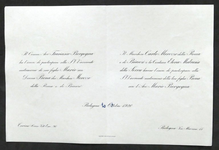 Invito Nozze avvocato Mario Borgogna con Donna Bona dei Marchesi Morozzo - 1920