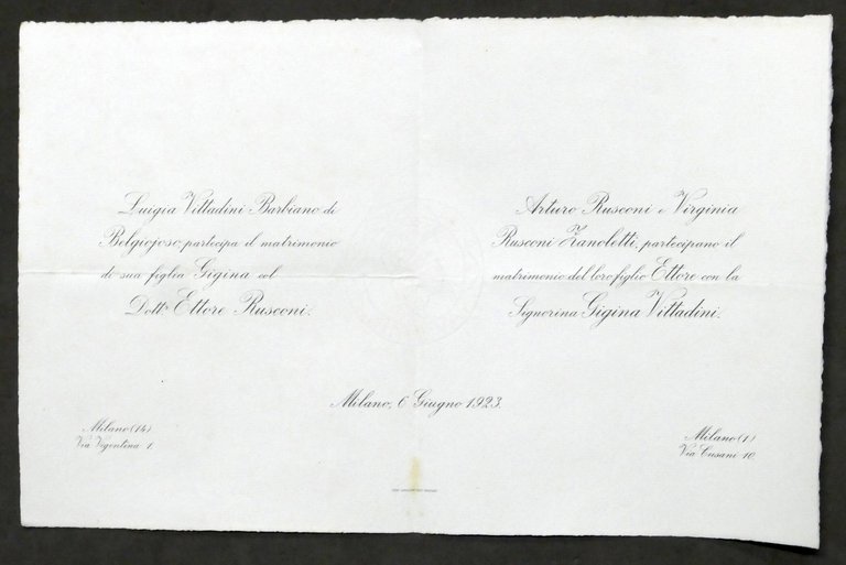 Invito Nozze dottor Ettore Rusconi e la signorina Gigina Vittadini - Milano 1923
