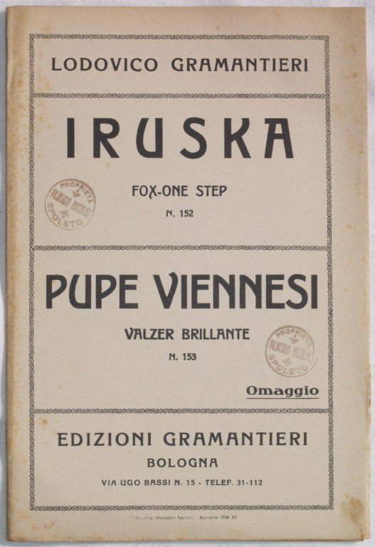 In 8. cm 26,5x18. pp. 35. Partitura completa per orchestra del 1934 di due canzoni. Caratteristica copertina decorata dell'epoca. Ex libris sulla copertina ed in alcune pagine. Buone condizioni; bruniture in copertina. A complete score for orchestra of 1934. Carachteristic decorated cover of that period. Ex libris in the cover and in some pages. Good conditions, yellowings in the cover.