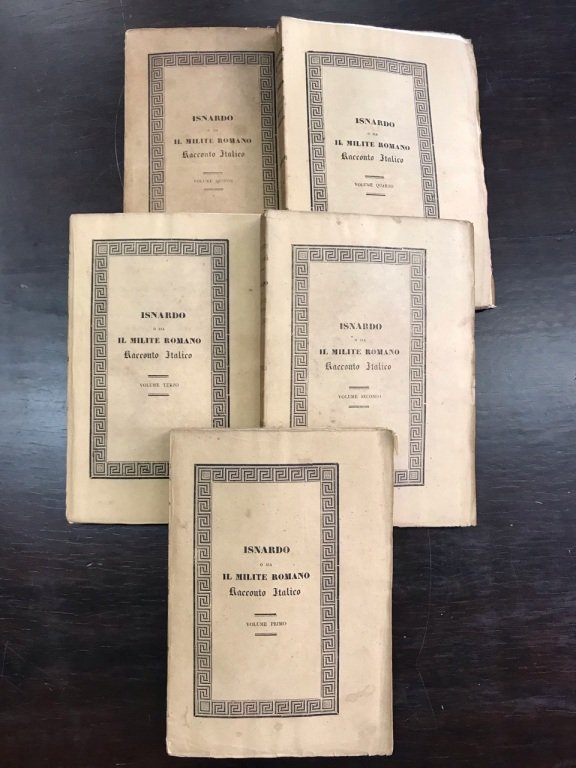 5 volumi in-8° (cm. 23,5), brossure editoriali a stampa (piccole mancanze alla testa e al piede), carte in buono stato e in barbe, lievi fioriture sparse. Prima edizione del romanzo storico del letterato bergamasco. Esemplare genuino. (SK5)