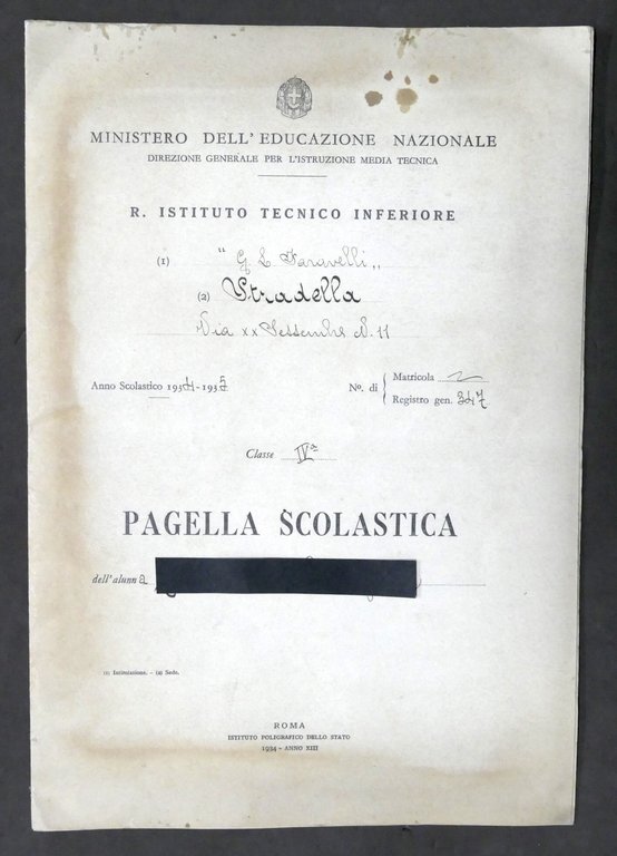 Istituto Tecnico Faravelli di Stradella - Pagella scolastica classe IV - 1934