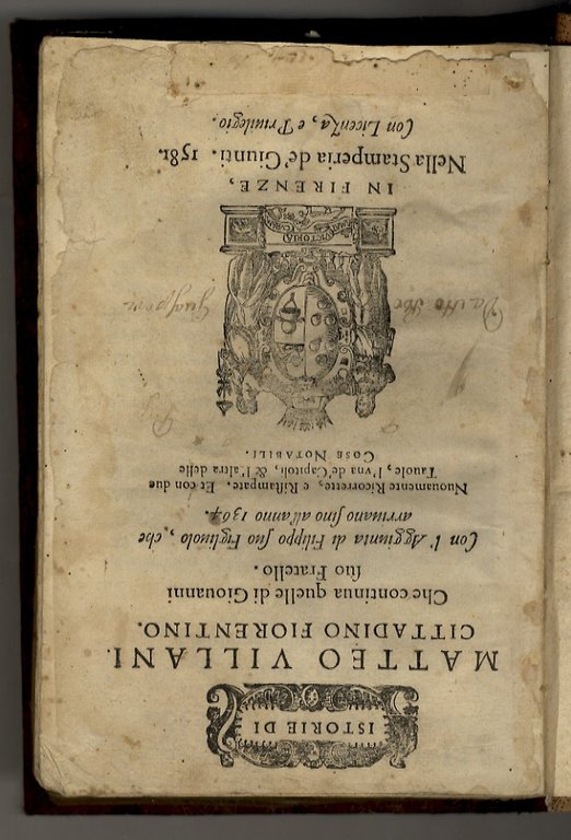 Istorie di Matteo Villani cittadino fiorentino. Che continua quelle di Giovanni suo fratello. Con l'aggiunta di Filippo suo figliuolo, che arrivano sino all'anno 1364. Nuovamente ricorrette, e ristampate. Et con due tavole, l'una de' Capitoli, & l'altra delle cose notabili. [Legato con:] Villani Matteo. Della historia di Matteo Villani cittadino fiorentino. Li tre ultimi libri. Che son' il resto dell'Istoria scritta da lui, che nelli stampati sino ad'hora mancano. Con un'aggiunta di Filippo Villani suo figliuolo, ch'arriva sino all'anno 1364. Nuovamente posta in luce. Con due tavole una de' capitoli, e l'altra delle cose più notabili.