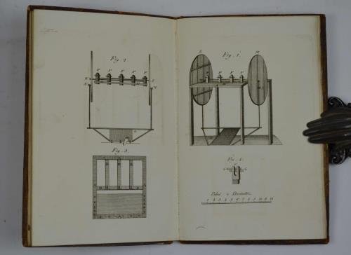 Cm. 21, pp. 21 (3). Con 2 tavole calcografiche in fine con complessive 4 figure relative a una macchina per la filatura del cotone. Bella legatura coeva in piena pelle con decorazioni in oro. Sguardie marmorizzate. Ottimo stato di conservazione. Prima edizione.