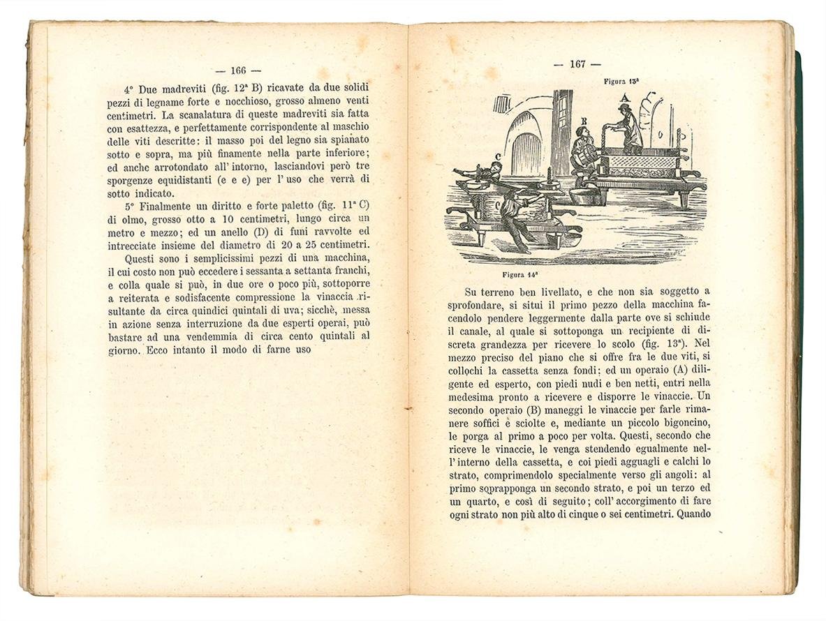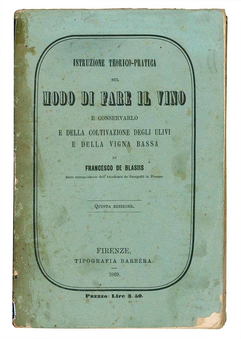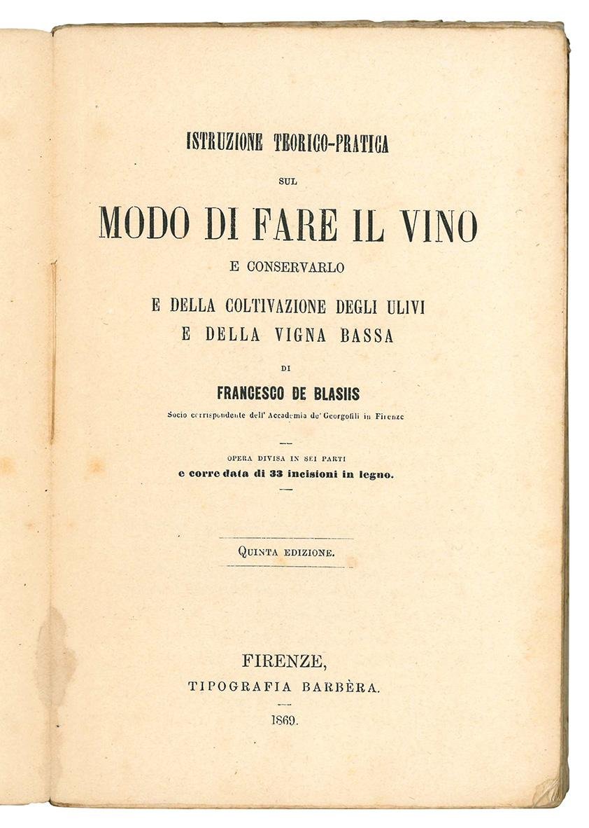 In 8vo (mm 190x124); pp. VII, [1], 352. Occhietto, illustrazioni in bianco e nero nel testo. Alcune carte leggermente ed uniformemente brunite, lievi fioriture. Brossura azzurra originale. Copertine e dorso un po' sporche, dorso aperto e copertina posteriore staccata. Un po' sciolto. Opera divisa in quattro parti: teorica della vinificazione, siti ed utensili occorrenti alla fabbricazione del vino, precetti pratici per la fabbricazione e conservazione delvino, dei vini che fanno eccezione.