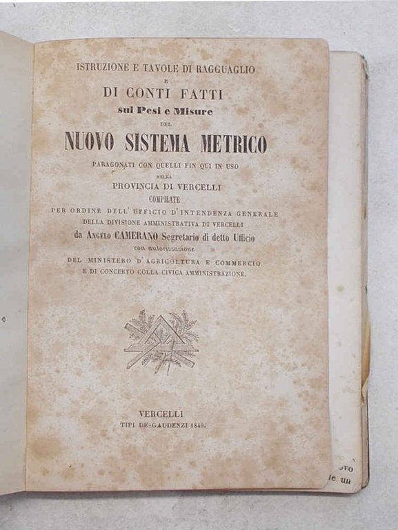 Istruzioni e tavole di ragguaglio e di conti fatti sui Pesi e Misure del Nuovo Sistema Metrico paragonati con quelli fin qui in uso nella provincia di Vercelli.