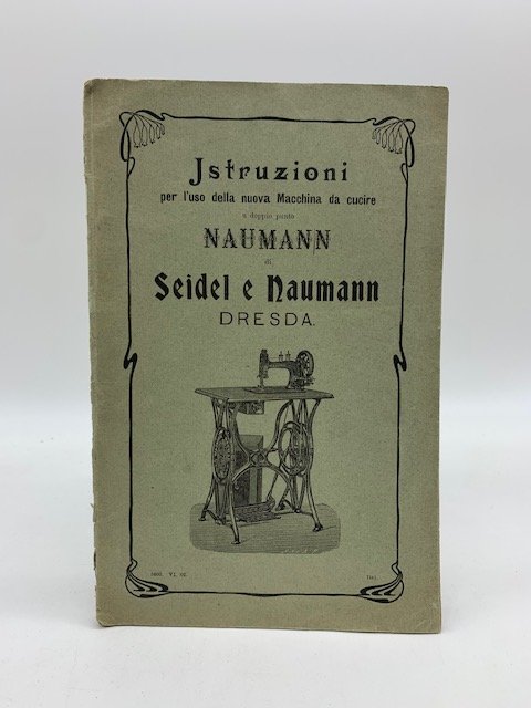 In 8 (cm 14 x 22), pp. 20 con grandi illustrazioni nel testo a piena pagina compresa l'ultima pagina che presenta 121 piccole illustrazioni di tutti i pezzi di ricambio della macchina da cucire. Brossura editoriale con veduta dello stabilimento di Dresda al piatto posteriore. Istruzioni per l'uso di questa macchina da cucire prodotta in Sassonia dalla ditta Seidel e Naumann.