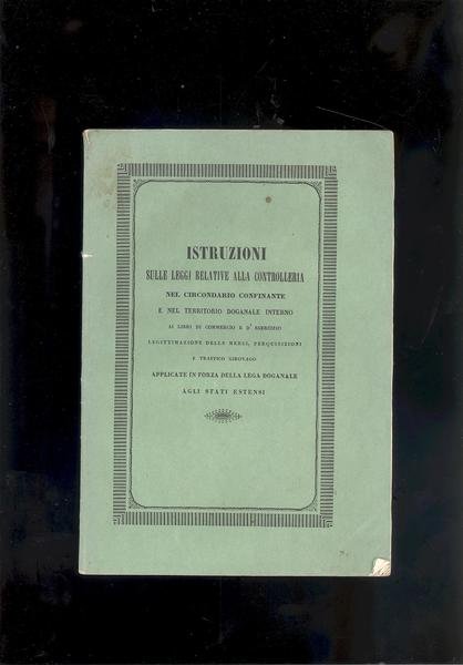 IN 8°, pp.35. BROSSURA EDITORIALE VERDE CON TITOLO ENTRO CORNICE. ISTRUZIONE SULLE LEGGI RELATIVE ALLA CONTROLLERIA NEL CIRCONDARIO CONFINANTE E NEL TERRITORIO DOGANALE INTERNO AI LIBRI DI COMMERCIO E D'ESERCIZIO, LEGITTIMAZIONE DELLE MERCI, PERQUISIZIONI E TRAFFICO GIROVAGO APPLICATE IN FORZA DELLA LEGA DOGANALE AGLI STATI ESTENSI. OTTIMA CONSERVAZIONE. ID 631