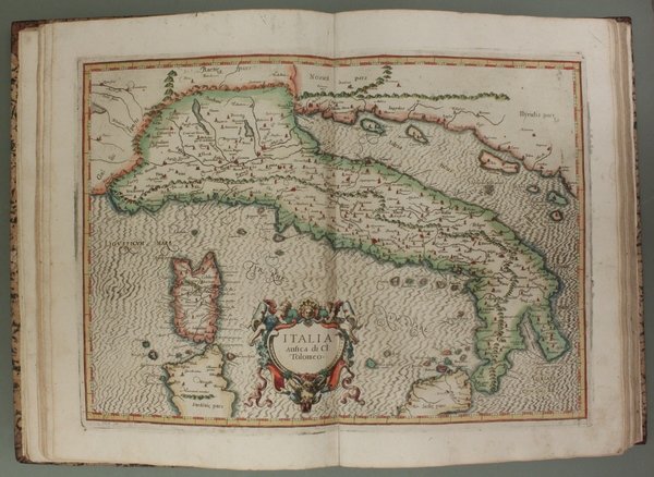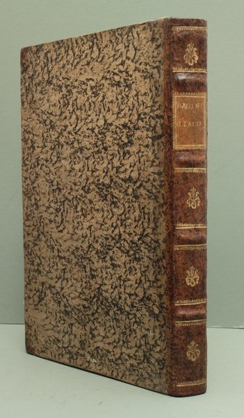 In-folio; 4 carte, compreso il titolo inciso con figure allegoriche opera di Oliviero Gatti, 24 pagine, 61 tavole colorate anticamente, delle quali 58 a doppia pagina, 2 a piena pagina e 1 (Isola d'Elba) pi— piccola, portata nel '700 in questo esemplare al formato dell'Atlante. Bella legatura settecentesca in mezza pelle e angoli con greche, filetti e tassello in oro al dorso e carta marmorizzata ai piatti. Ex libris: principe di Soragna. Minime tracce di antichi consolidamenti a qualche braghetta. Piccolo strappo riparato anticamente nel margine bianco della carta di Ischia.