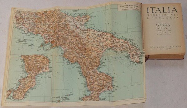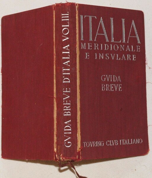 Bella guida del 1951 del Touring Club Italiano sull'Italia Meridionale ed insulare, volume terzo.<BR>La guida descrive Campania, Puglia, Calabria, Sicilia, Sardegna.<BR>All'interno sono presenti ben 5 carte geografiche colorate generali, 25 piante di città colorate (Agrigento, Bari, Benevento, Brindisi, Cagliari, Catania, Catanzaro, Cosenza, Lecce, Matera, Messina, Napoli, Palermo, Pompei, Potenza, Reggio Calabria, Salerno, Sassari, Siracusa, Taormina, Taranto, Trapani).<BR>All'inizio del volume vengono date una serie di informazioni generali per le regioni: i trasporti, gli alberghi, la condizione delle strade; tutte le regole per viaggiare in treno.<BR>Dopodichè vengono descritti i vari percorsi. Bel volume in buone condizioni e completo. Copertina in tela editoriale in discrete condizioni generali con lievi usure ai margini e dorso. Rottura alle cerniere. (vedere foto). Legatura in buone condizioni. All'interno le pagine si presentano in buone condizioni. In 16. Dim. 16x11 cm. Pp. 382+XXIII. Beautiful guide of 1951 of the Touring Club Italiano about Southern Italy and Islands, third volume.<BR>The guide describes Campania, Puglia, Calabria, Sicilia, Sardegna.<BR>Inside there are 5 coloured general maps, 25 coloured plans of cities (Agrigento, Bari, Benevento, Brindisi, Cagliari, Catania, Catanzaro, Cosenza, Lecce, Matera, Messina, Napoli, Palermo, Pompei, Potenza, Reggio Calabria, Salerno, Sassari, Siracusa, Taormina, Taranto, Trapani).<BR>At the beginnign of the volume alla series of general information for regions: transports, hotels, conditions of streets; all the rules to travel by train. Then different routes are described. Beautiful volume in good conditions and complete. Cloth editorial cover in good general conditions slightly worn in the edges and spine. Crack in the hidge. (see the photo). Binding in good conditions. Inside pages are in very good conditions. In 16. Dim. 16x11 cm. Pp. 382+XXIII.