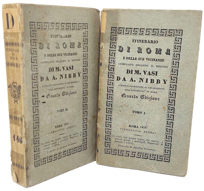 >2 vol. in-12, pp. complessive 728 (2), Legatura edit. cart. con bordura silogr. e titolo sui piatti. Importante l'Avvertimento al Lettore (pp. 5-8) con la storia delle edizioni dell'opera, già inserito nella guida del 1830. Con 2 piante ripieg. di Roma antica e moderna e complessive 40 tavole di vedute e piante inc. in rame all'acquatinta. Grazioso esempare di importante guida di Roma. Non in Schudt. Rossetti G-1611. Comune Roma, Le guide antiche, n. 132. Caldana, Le guide di Roma, p. 236.