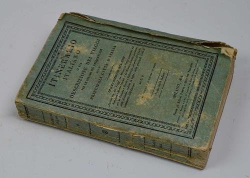 Cm. 19, pp. xxxiv (2) 251. Con 16 (di 17!) tavole incise in rame e ripiegate fuori testo di itinerari compiuti attraverso le varie parti d'Italia. Legatura originale in cartoncino a stampa con chiusura a portafogli. Qualche segno d'uso, ma esemplare genuino e ben conservato. Celebre guida per il viaggiatore italiano, preziossima fonte di notizie che conobbe grande successo nel corso di tutto l'800 ed ebbe innumerevoli ristampe. Esemplare mancante della tavola "Da Milano a Bologna per Piacenza".