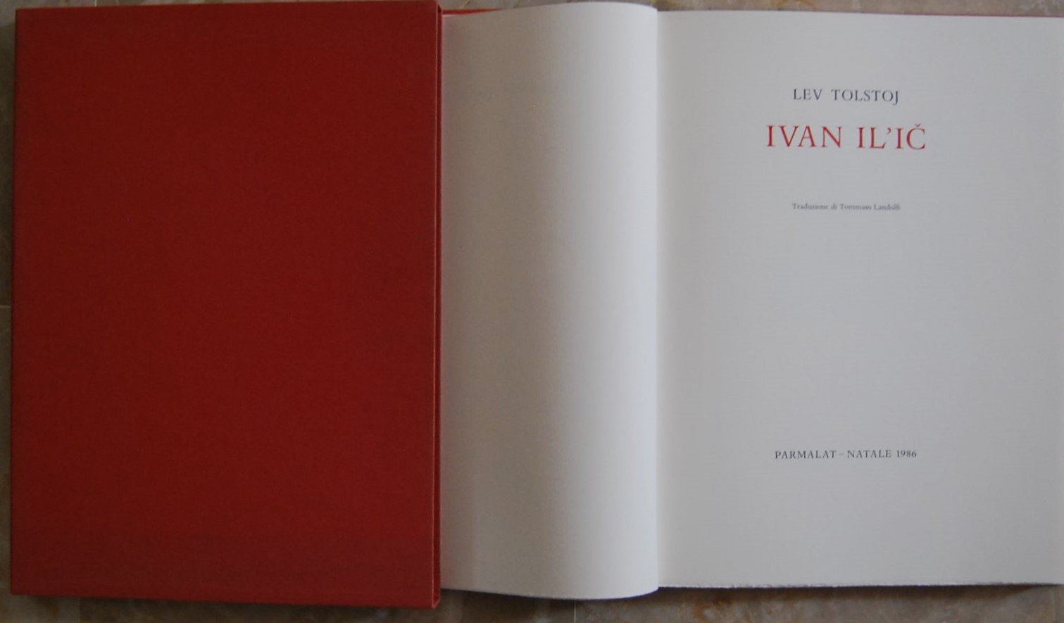 Parmalat, 1986. In-4, mezza pelle, sovracoperta in acetato, cofanetto, titolo oro al dorso, taglio superiore dorato, pp. XIII,59, con una fotografia di Tolstoj. composta nel carattere Dante ed impressa a cura di Martino Mardesteig su carta intonsa delle cartiere Magnani. La rilegatura a mano e' stata eseguita da Mario Rigoldi di Monza. La stampa e' stata eseguita dalla Stamperia Valdonega di Verona. In ottimo stato.