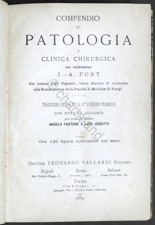 J.A. Fort - Compendio di Patologia clinica e chirurgica - traduzione fatta sulla II^ ed. francese, con note ed aggiunte per cura dei dottori Angelo Pastore e Luigi Cerutti - 1^ ed. 1884 Pag. 751, con 122 figure intercalate nel testo Legatura in mezza pelle - Testo in italiano Condizioni molto buone.
