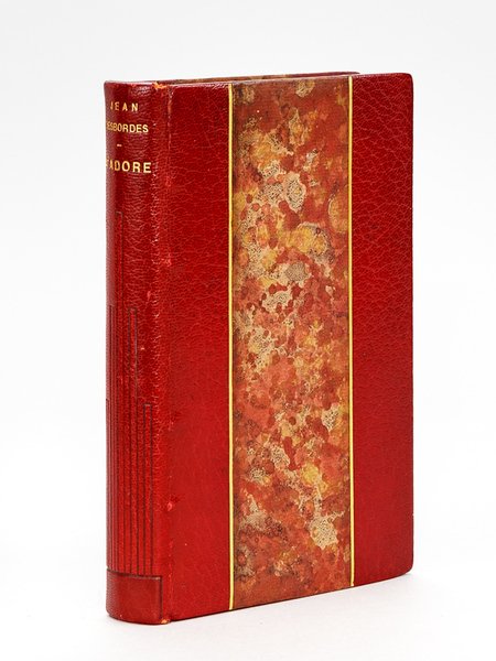 Exemplaire sur Madagascar avec mention manuscrite "plus un ex. d'archives" n°1/1" signé L.B., 1 vol. in-12 reliure de l'époque demi-maroquin rouge à bandes, filet doré en mors et bandes, dos lisse estampé à froid, tête dorée, couvertures et dos conservés, Bernard Grasset, Paris, 1928, 224 pp. Rare exemplaire du tirage de tête sur Madagascar dont la justification annonce 11 exemplaires, mais dont une mention précise "plus un ex. d'archives" sur Madagascar et "n°1/1" signé d'un "L.B." à identifier (on relève en garde une petite étiquette, peut-être de reliure, portant les initiales entrecroisées L B et O C). Charmant exemplaire (très petite fente à un mors en tête avec infime petit mq. en coiffe) bien relié. Secrétaire et amant de Cocteau, Jean Desbordes (1906-1944) publie "J'Adore" en 1928 ; l'ouvrage est enrichi d'une belle préface de Cocteau (il y compare le génie de Radiguet au génie de Desbordes), qui lui confiera un rôle dans son film "Le Sang d'un poète". Après sept ans de vie commune, il quittera Cocteau et se marie en 1937. Responsable d'un réseau de résistance, il mourra héroïquement, torturé par la Gestapo, le 6 juillet 1944.