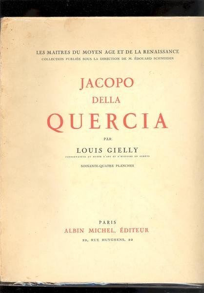 IN 4, pp.90 + TAVOLE 64 f.t.in b/n. COPERTINA IN LEGATURA ALLA FRANCESE CON TITOLO IN ROSSO. JACOPO DI PIETRO D'AGNOLO DI GUARNIERI DETTO DELLA QUERCIA ( SIENA 1374 - 1438 ), SCULTORE IUTALIANO. TENTO' UNA SINTESI FRA LA SCULTURA GOTICA DI GIOVANNI PISANO E QUELLA BORGOGNONA, IN SPECIAL MODO DI CLAUS SLUTTER DA UNA PARTE, CON LA CLASSICITA' DALL'ALTRA, ASSIMILATA ATTRAVERSO LE NUOVE SCOPERTE DEL RINASCIMENTO FIORENTINO. IL SUO MAGGIORE INTERESSE SI RIVOLSE ALLE FIGURE, RESE MONUMENTALI E PERCOSE DA UNA VITALITA' PROROMPENTE. FU UN ARTISTA ISOLATO E INCOMPRESO E, SUCCESSIVAMENTE VENNE CAPITO SOLAMENTE DA MICHELANGELO. TRA LE SUE OPERE PIU' SIGNIFICATIVE RICORDIAMO : LA MARMOREA MADONNA DELLA MELAGRANA A FE. - IL MONUMENTO A ILARIA DEL CARRETTO A LU. - LA FONTE GAIA A SI. - IL PORTALE DI S. PETRONIO A BO. OTTIMA CONSERVAZIONE DI QUESTA BELLA E RARA<BR>MONOGRAFIA INTONSO, TIRATA IN 1650 ESEMPLARI. ID 4005