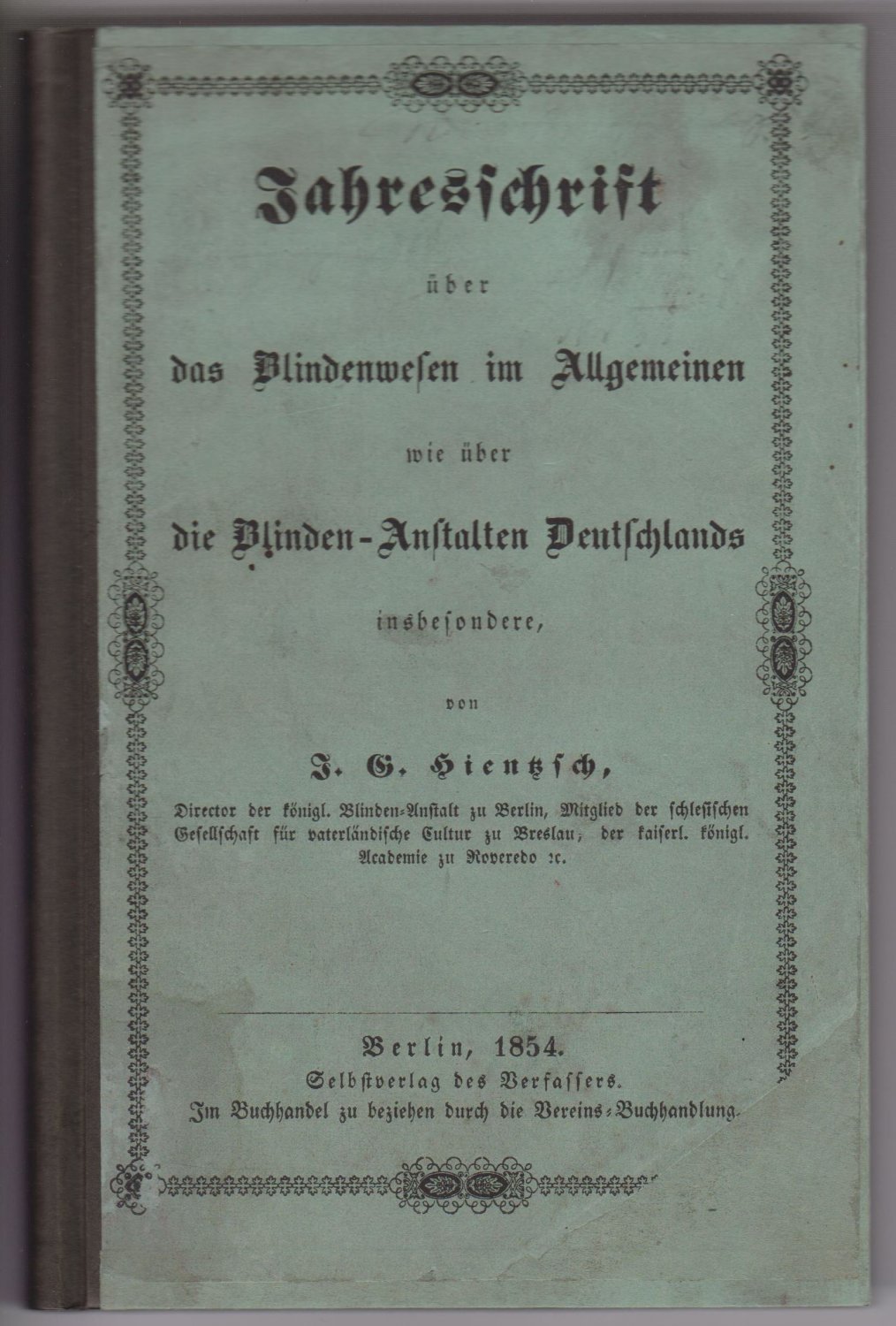 Verfasser war u.a. Direktor der königlichen Blindenanstalt zu Berlin. Enthält: Nachrichten über einen neuen Blindenverein in Berlin sowie die neue Blinden-Anstalt, Statistische Aufnahme sämtlicher Blinden in der Provinz Brandenburg im Jahre 1852 und in den Provinzen des preußischen Staates. Nachrichten über die Blinden-Anstalten in Deutschland, im Königreich Preußen und ganz Europa und den USA. Ferner über Augenheilkunde, Unterrichtswesen in den Anstalten, verschiedene Biographien etc.