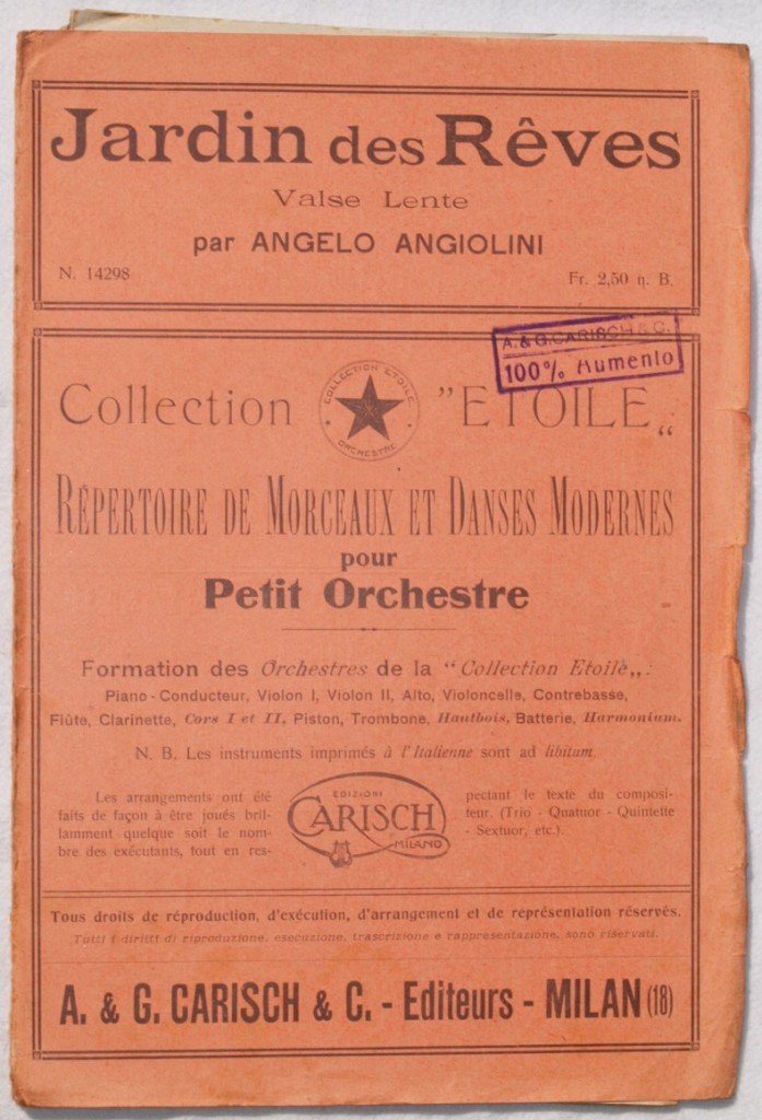 Bello spartito, partitura completa per orchestra senza data ma degli anni '20 di una canzone. Caratteristica copertina illustrata d'epoca. GENERE: Valzer STRUMENTI: violino; violoncello; contrabasso; flauto; clarino; trombone; cornetta ANNO: anni '20 DIMENSIONI: In 8. cm 28x19 PAGINE: pp. 9 CONDIZIONI: In buone condizioni; dorso usurato NOTE: ex libris in copertina. Beautiful score of one song, a complete score for orchestra of 1920's. Carachteristic decorated cover of that period. MUSIC: Waltz STRUMENTI: violin; violoncello; contrabbass; flute; clarion; trombone; little horn YEAR: 1920's SIZE: In 8. cm 28x19 PAGES: pp. 9 CONDITIONS: In good conditions; worn spine NOTES: