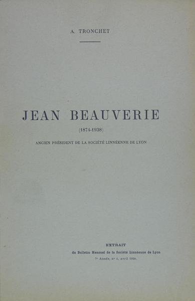 Extrait du Bulletin Mensuel de la Société Linnéenne de Lyon, 1938. Plaquette in/4 couverture imprimée, un portrait de Beauverie, 7 pages. J. Beauverie (1874-1938) fut botaniste, spécialiste de mycologie., professeur à la Faculté des sciences de Lyon.
