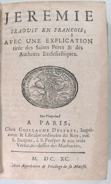 A Paris chez Guillaume Desprez 1690, reliure plein veau brun, dos à 5 nerfs, caissons ornés de fleurons dorés, fort in/8 de 826 pages, 8 pages de table, 90 pages pour Baruch traduit en François avec une explication des saints pères & des auteurs ecclésiastique, table 2 pages. Jérémie est un personnage de la Bible qui apparaît principalement dans le livre de Jérémie, dont il est souvent présenté comme l'auteur. Il est également évoqué dans le deuxième livre des Chroniques. C'est un prophète du Tanakh dans le judaïsme ou de l'Ancien Testament pour les chrétiens.