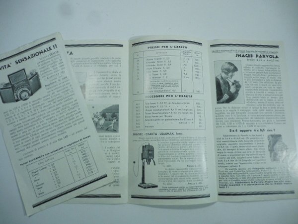 Pieghevole a 3 falde cm 36 x 23 con illustrazioni nel testo. Si aggiunge altro foglietto singolo e nello stesso formato dedicato alla Exacta con autosscatto. Oltre alll'Exacta sono descritti altri modelli quali: Parvola e Parvola a 2 formati